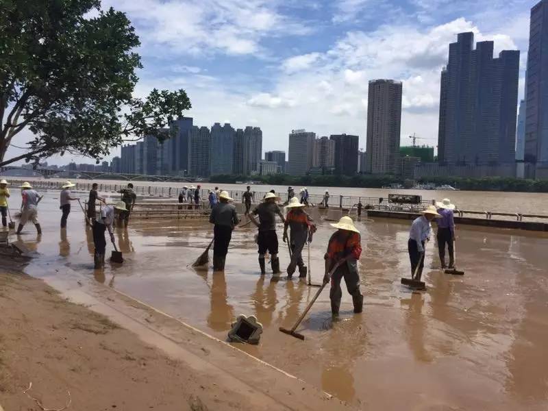 7月7日,橘子洲早已露出地面,工人正在清扫淤泥。