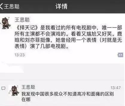 在《择天记》播出的时候,鹿晗的演技就受到了很多网友的质疑,其中就有娱乐圈的纪检委王思聪,评价鹿晗用一个表情演完了一部剧。