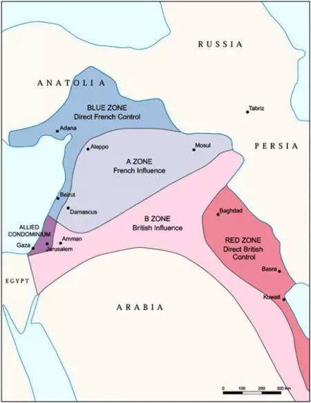 ★ 图解:赛克斯-皮科协定划定的疆界。图中紫色区域包括加沙地带和耶路撒冷,由协约国共管。红色区域从巴格达、巴士拉、科威特延伸到波斯湾南岸,由英国直接控制。蓝色区域从贝鲁特向北到土耳其本土安纳托利亚的东南部,由法国直接控制。在蓝色和红色两个区域之间,建立了两个缓冲区,淡青色的“A区”是法国的势力范围,包括大马士革、阿勒颇和摩苏尔。粉色的“B区”是英国势力范围,包括安曼。