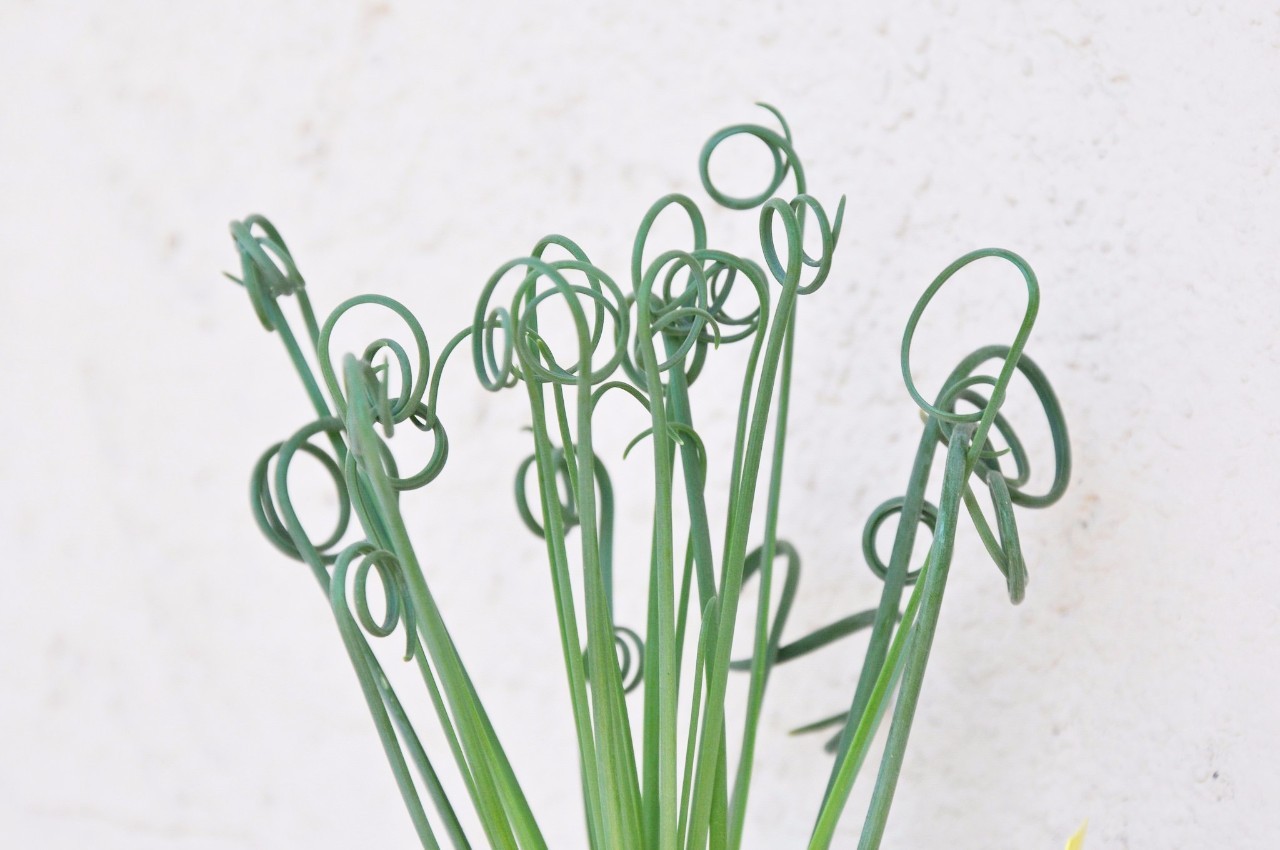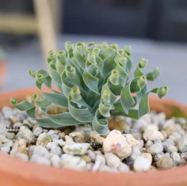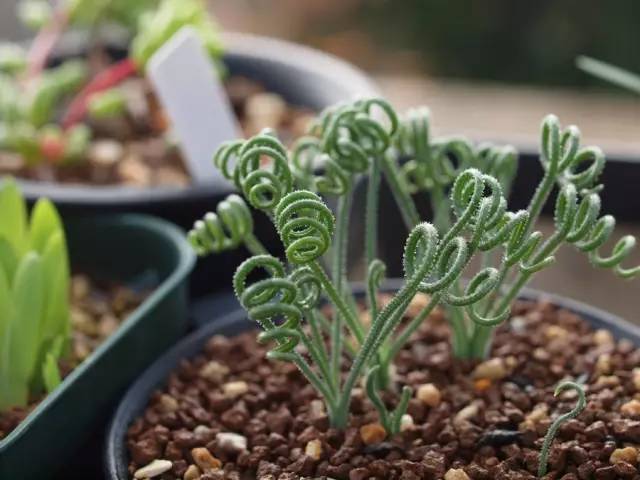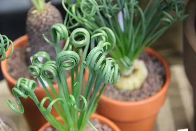 细弹养得好不好,要看头发卷不卷。弹簧草并非从小到大都是大波浪卷,因为刚从鳞茎中抽出的新叶是直立生长的,而后在叶片先端,朝着随机方向逐渐扭曲盘旋。不同的个体,在不同的养护条件下,叶片卷曲的程度也不尽相同:在光照充足、昼夜温差大的情况下,叶片会像卷发棒一样,密实而重复地卷曲着,这是最佳的品相。