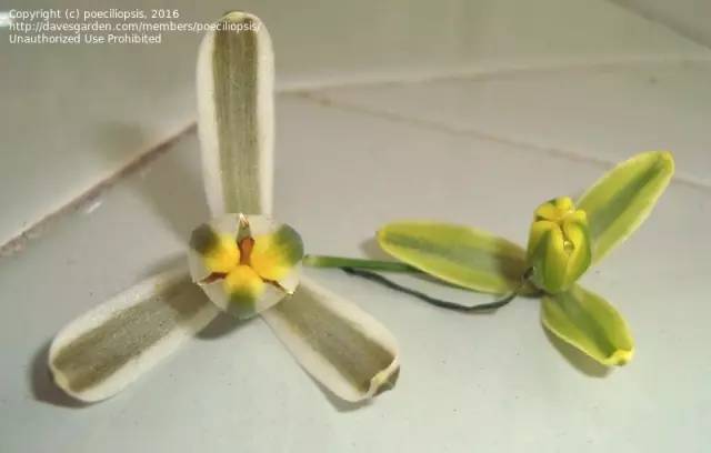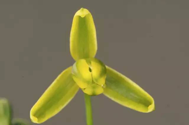 在休眠之前,细弹还会开花。总状花序从叶丛中抽出,着生下垂开放的小花,如同挂着一串铃铛般可爱。小花由两轮6枚花被组成,并在先端形成倒钩(喙),并产生黏液。花被为明艳的黄绿色,中间有道深绿色条纹,气味独特,有人描述为香草味,尤其在白天阳光充足时候最为浓郁。
