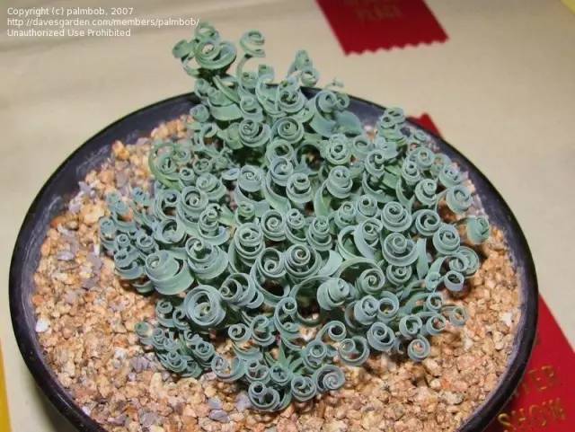 海带弹簧草Albuca crispa,这是最近几年才被描述的弹簧草,它们的叶片并非是螺旋扭曲,而是在叶缘形成大波浪,玩家称之为海带卷。(细弹被称为开瓶器卷,宽弹被称为彩带卷)