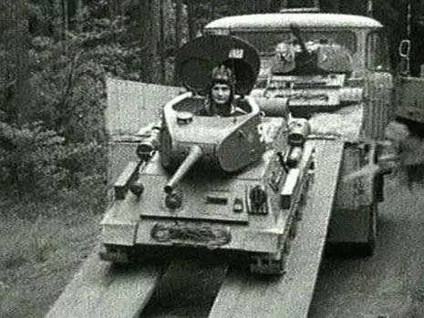 东德少年先锋队坦克旅的迷你坦克被汽车运到训练基地。