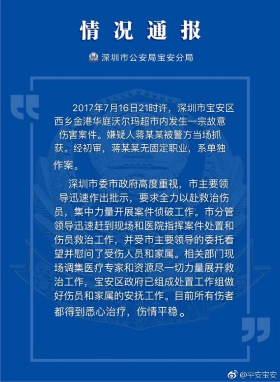 未来网(www.k618.cn)北京7月17日电(记者 辛欣)深圳市公安局宝安分局官方微博@平安宝安昨日(16日)深夜(23:53)发布通报,2017年7月16日21时许,宝安区西乡金港华庭沃尔玛超市内,一名男子持菜刀伤人。目前已有2人死亡,9人受伤。宝安警方接到报警后迅速赶赴现场,将嫌疑人蒋某某(男,30岁,重庆人)抓获。