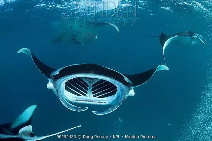 滤食的双吻前口蝠鲼,海水裹挟着食物进入它的大口。图片:Doug Perrine / NPL