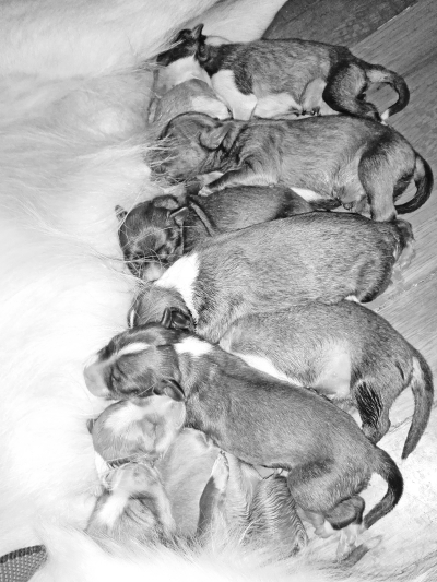 9只狗宝宝都蛮健康,它们爱挤在一起,躺在狗妈妈怀里,眯着眼睛,惬意地吃奶。