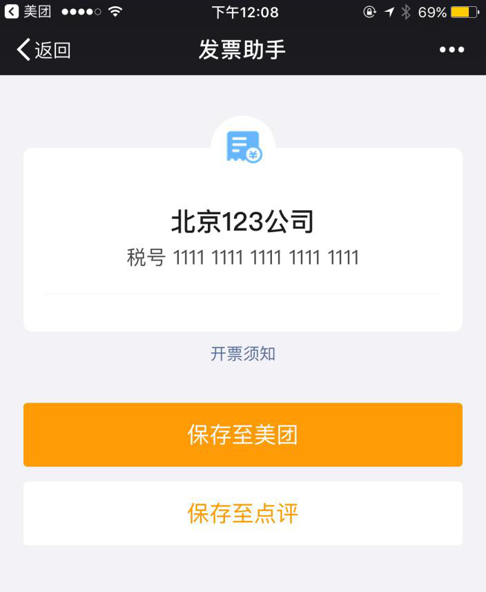 此时,发票抬头信息保存后,用户可以在美团APP中,通过“我的—发票助手—我的发票抬头”中,对多个发票抬头信息进行查看和管理。当用户开发票时,可以直接将已保存的发票信息,出示给商家使用,省去用户手写发票抬头及其他信息的步骤。