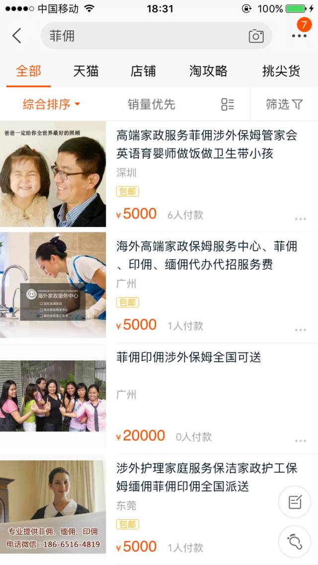 外事儿(微信ID:xjb-waishier)在淘宝中输入“菲佣”,会出现数页搜索结果,多数“发货地址”显示为广东和上海。