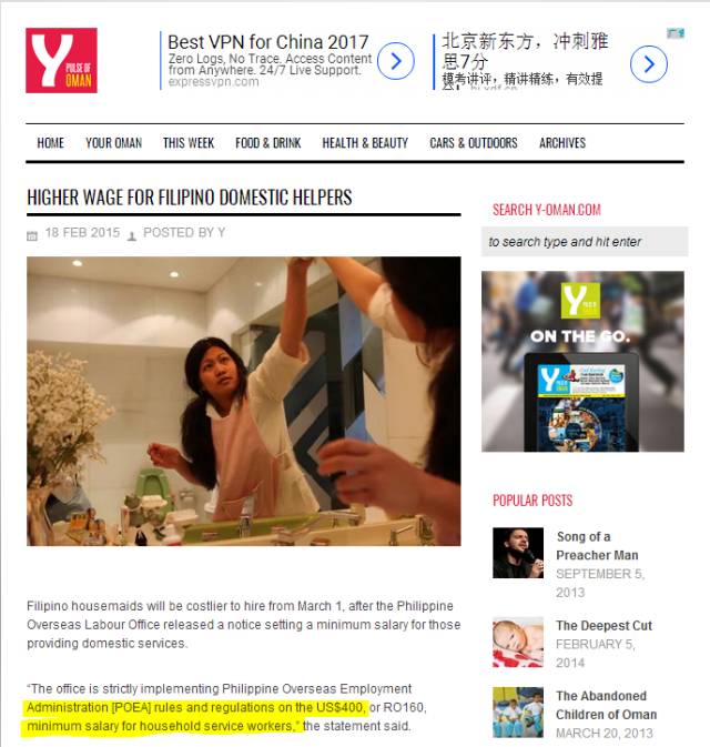 阿曼政府自2011年起规定,菲佣的月薪不得低于400美元(约合人民币2690元)。