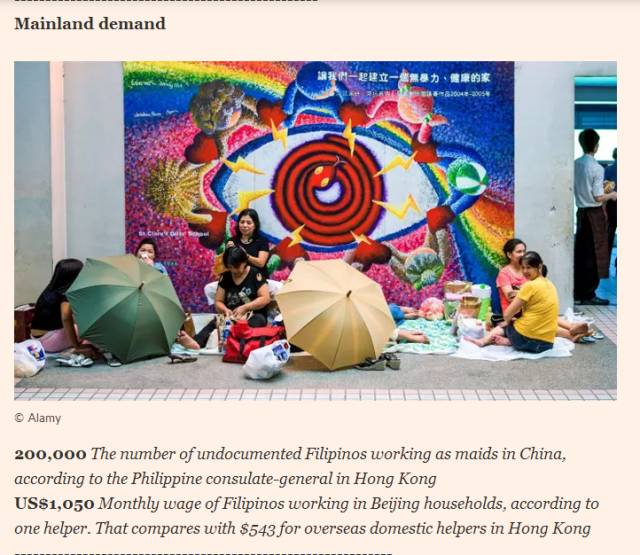 去年9月,英国《金融时报》一篇题为《中国新的进口项目:女佣黑市不断增长》报道中提到,在中国大陆工作的无证菲佣约有20万。