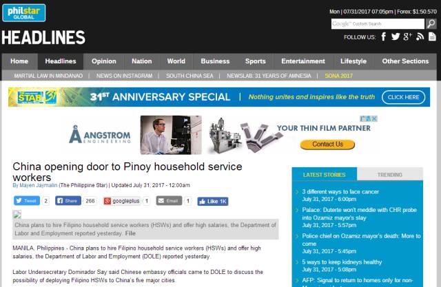 该报网站发布了一篇题为“中国向菲律宾家政服务人员敞开大门”的报道。