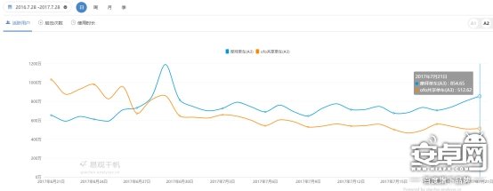 从日活跃用户量数据显示,在7月21日摩拜日用户活跃量为855万,ofo则为513万,摩拜领先67%;日活跃用户量单月走势即6月21日至7月21日,摩拜从653万增长至855万,增幅为31%,而ofo从1031万下滑至513万,降幅为50%。