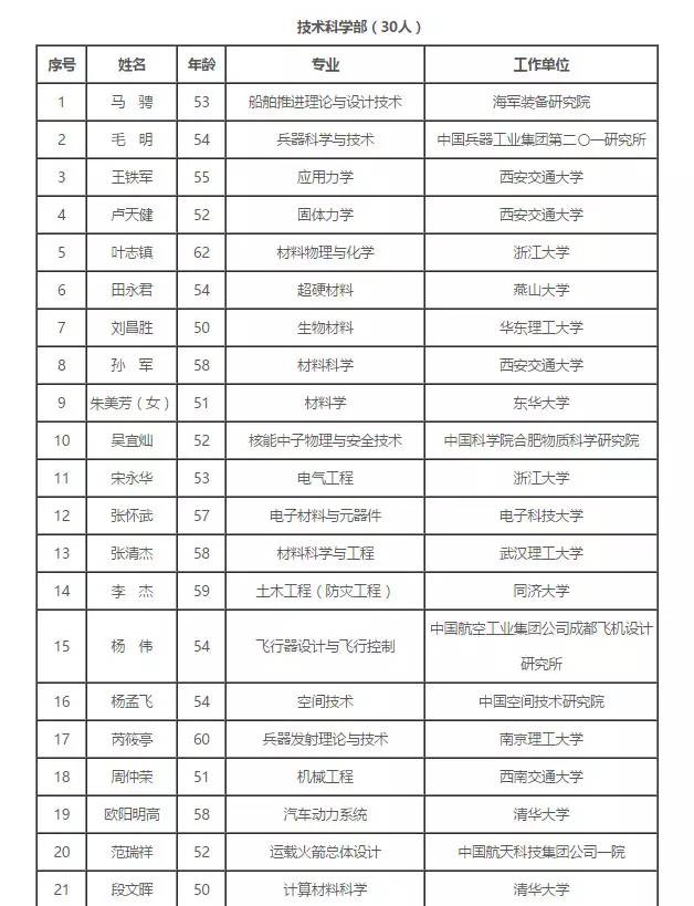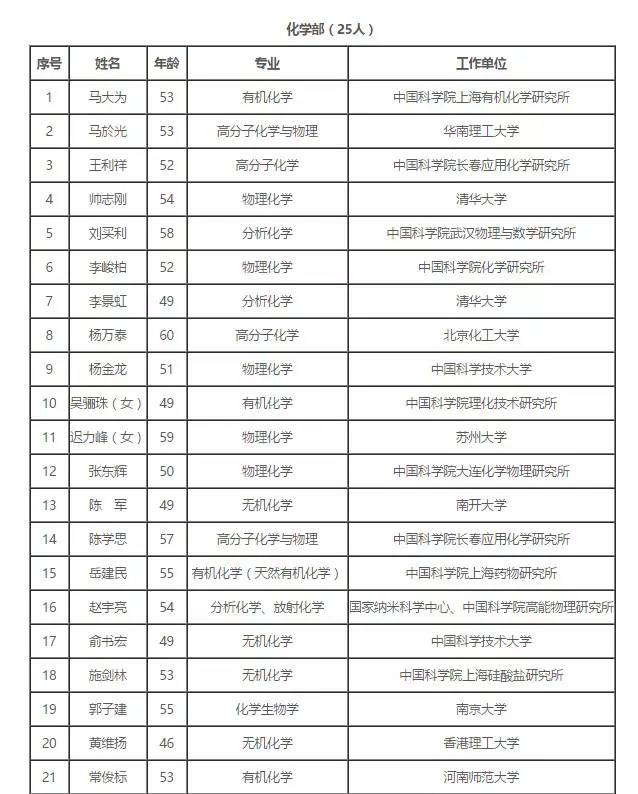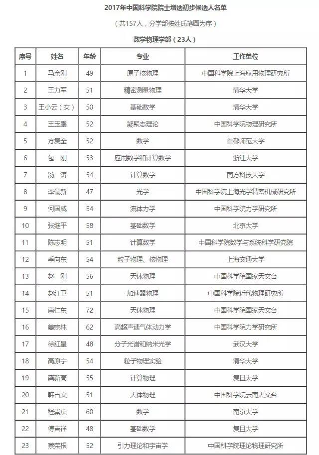 此次公布的157名初步候选人中,数学物理学部23人、化学部25人、生命科学和医学学部32人、地学部27人、信息技术科学部20人、技术科学部30人。其中年龄最大的72岁,为中国科学院国家天文台天体物理学家南仁东;年龄最小的39岁,为清华大学膜蛋白结构生物学家颜宁。