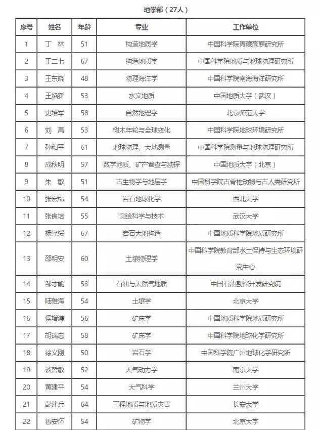 中科院院士增选每两年进行一次。据了解,2017年中国科学院院士增选名额基数为60名,其中数学物理学部10名、化学部10名、生命科学和医学学部12名、地学部10名、信息技术科学部7名、技术科学部11名。