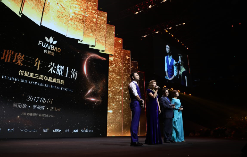 2017年8月1日,国产化妆品企业付爱宝商贸股份有限公司,在上海梅赛德斯奔驰文化中心举行以“璀璨三年,荣耀三年”为主题的三周年盛典。当天,国内知名偶像明星、FUYIME护肤品品牌代言人明道;人气歌手、付爱宝公司旗下姿纤逸·沙棘酵素纤之冻以及FUYIME胶原低聚肽沙棘果浆代言人宇桐非亲临现场站台分享美丽秘密,更有央视知名主持人水均益、李梓萌、尼格买提、朱迅组成强大主持阵容,邵星颖、张娜、星月传说、江源亭漪等歌手发声嗨爆全场,盛况非常。盛典邀请百余家媒体到场参与,并有多位时尚达人进行全网实时直播,吸引了无数的关注,数万人欢聚一堂,共同见证了付爱宝年度盛典的盛大举行。