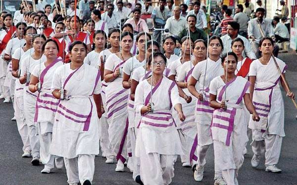 RSS还有并行的妇女组织“全国妇女志愿者委员会”(Rashtra Sevika Samiti,简写也是RSS),同样组织会员统一着装,军事训练,舞枪弄棒,砍刀握剑。