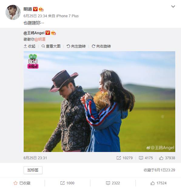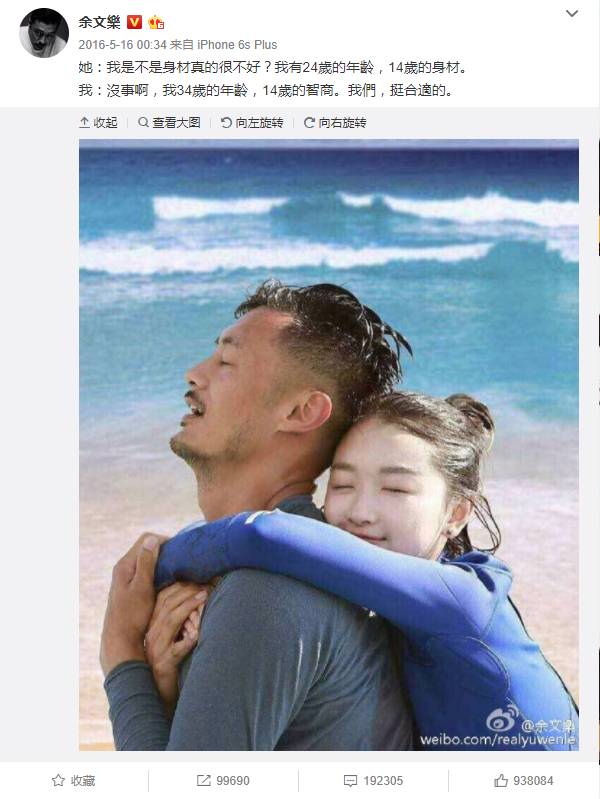 渐入佳境后,余文乐又趁热在微博上发了一条告白微博,点赞量几十万。