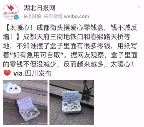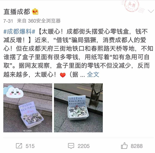 通过此事,我们觉得成都做为新一线城市的排头兵,虽然快速发展但依旧是一个非常有温度的城市。像街头自取硬币箱这样小小的善念,只要是能影响到其他人,有人愿意传播善念,获得反馈往往都出乎意料,自媒体做出恰当的舆论引导,精神传播效果是非常明显的。