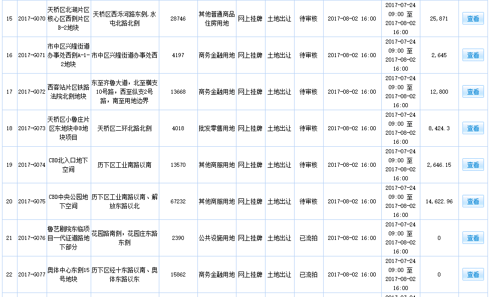 8月4日上午9:30,济南国土资源局挂牌出让的土地挂牌时间截止,正式进入网上竞拍环节。此次出让的土地一共23宗,总出让面积1831亩,范围涉及历城、历下、市中、天桥、槐荫五区,全部位于主城区。