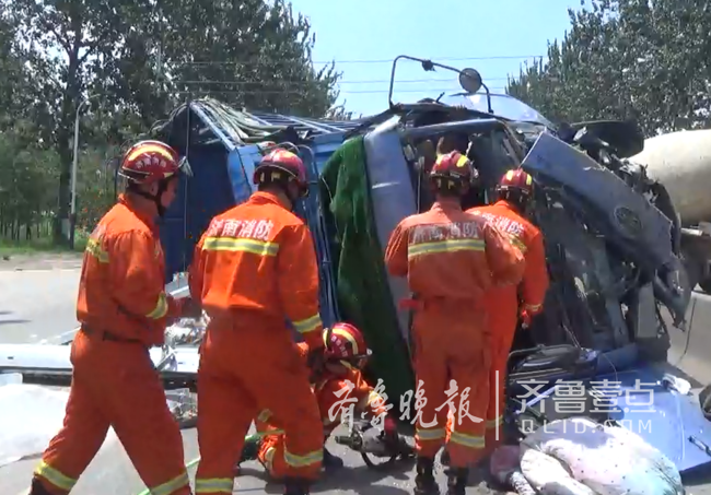 8月4日下午13时05分,济南公安消防支队梓东中队接到群众报警称:位于济南市大桥镇308国道坡西村路边,一辆小型货车与一辆的搅拌工程车发生相撞,小型货车车头严重变形,驾驶员被困车内, 情况十分紧急。