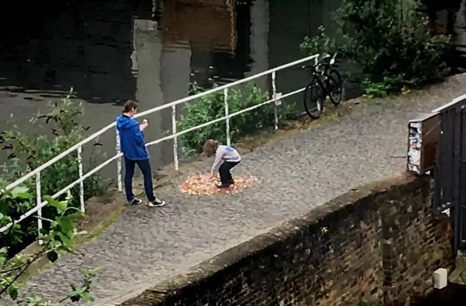 一位妈妈带着小朋友走过来,发现了这堆硬币,但他们并没有拿走任何硬币,只是一个劲儿的在硬币堆附近拍照,可能是诧异于街头这不寻常的一幕。