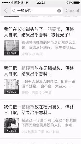 果然,接二连三地,除了杭州,上海、重庆、广州、成都、石家庄、南京、无锡、郑州、长沙、西安等城市的繁华路段,竟然都出现了这么一箱可以随便拿的硬币——全国几十个城市似乎同时都在进行所谓的“硬币测试”,过程和套路几乎一模一样。