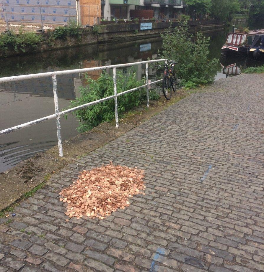 英国伦敦街头一条运河旁,放着貌似无主的15000枚2便士硬币,路人会有什么反应呢?