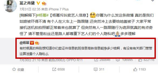 在此之前,杨幂在高铁上被人尾随,曾在微博怒斥叫卖艺人隐私信息行为:“有时候真的特别想知道你们卖证件信息航班信息高铁信息能挣多少钱啊,有没有有关部门管管这算泄露个人隐私么?”