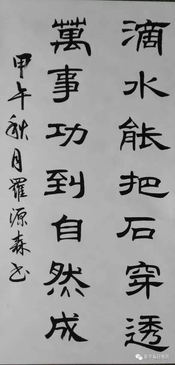 那是源森刚刚能握紧笔写字的时候,有一天,他正在家里玩儿,突然眼睛就瞄上了父亲案头的毛笔。父亲罗心海见状,索性就随意教他一些握笔的方式,没想到他拿着笔学得有模有样,就连笔画练习也一笔一划十分认真。