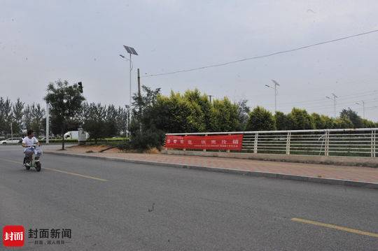 而在李文星“殒命水坑”的500米处,在两棵树之间,也挂着一条红色标语。类似标语,还被挂在从外环线通往附近村庄的道路两侧。