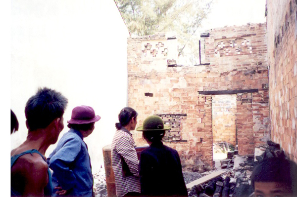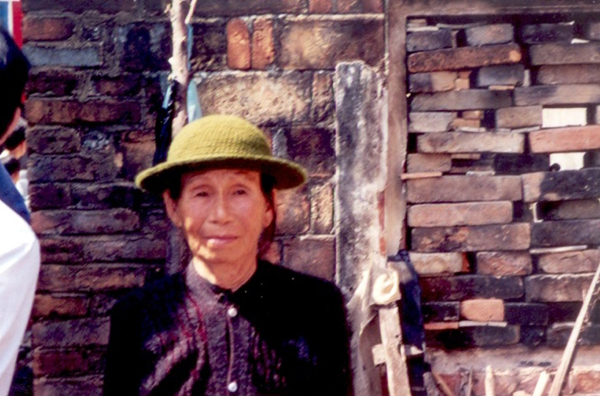 2000年,苏智良、陈丽菲、西野瑠美子等陪同黄有良老人去寻找慰安所的遗址,正遇上该房屋遭遇火灾,黄有良老人在藤桥慰安所遗址前留影,百感交集。苏智良供图
