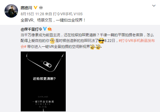 正当众人纷纷猜测新品会如何命名之际,保千里打令智能科技有限公司CEO唐德川转发了一条微博,微博小尾巴意外泄露了保千里打令VR二代新品的名称。通过这条微博的微博小尾巴,可以基本确认保千里打令VR手机新品被命名为V10S。此前保千里第一代产品同时推出了至尊版、精英版等多个版本,因此即将于8月22日举行的新品发布会上,除了确认将会发布这款名为V10S的新品外,是否还有其他版本同步推出仍未可知。