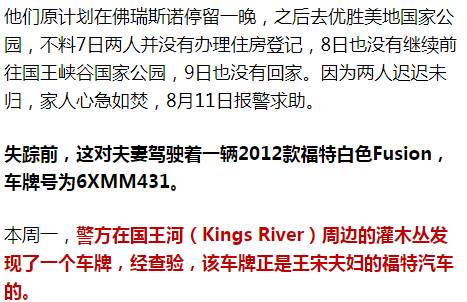 王一楠和宋洁均来自中国杭州,王一楠是加州大学圣地亚哥分校博士后,宋洁长期在中国居。夫妇两人日前驾驶一辆白色2012年福特福克斯轿车出游,最后一次露面是6日下午2时左右,当时他们刚参观完水晶岩洞。警方在公园附近的国王河岸意外发现一个车牌和部分车零件,牌照号码与失联夫妇的轿车相同。
