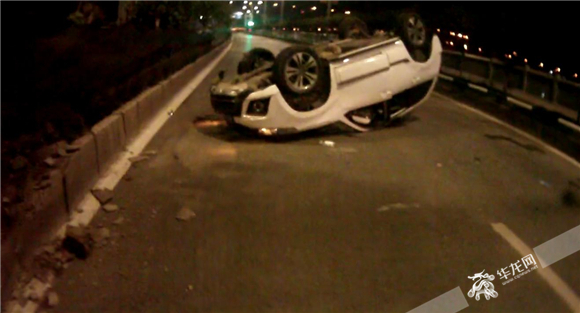 在现场,民警发现:在牛角沱往磁器口方向金沙港湾路段,一辆白色奇瑞SUV小轿车仰翻在公路中间,勘察认定是与道路中央隔离带撞击所致。好在事发时段路上车辆较少,并没有造成交通拥堵。