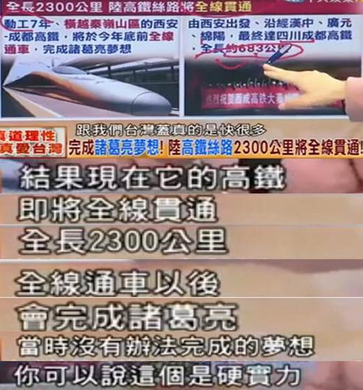 如今大陆高铁的发展可以说为世界的联通带来了便捷,虽然一些心怀叵测的“台独”分子有意抹黑,但仍不乏理智的民众客观评价,比如有台湾媒体在评价横越秦岭山区、全长2300公里的兰渝铁路时就赞它“完成了诸葛亮的梦想”: