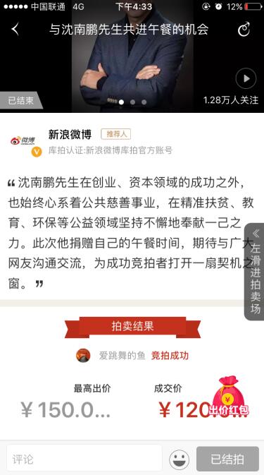 8月18日中午12点,在库拍平台上,众多线上用户盯着屏幕上不断闪过的出价信息,他们正在竞拍被誉为中国“巴菲特”的沈南鹏先生的午餐时间,作为红杉资本的创始人的同时也作为一名成功的企业家,拍卖活动受到了过万人的关注。经过231次的激烈竞价后,网名叫做“会跳舞的鱼”最终以150万人民币的绝杀,封顶价120万成交,拍下了这次的午餐时间。