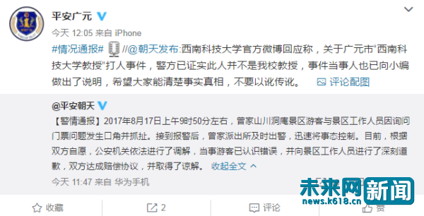 未来网(www.k618.cn)北京8月18日电(记者 宋霞霞)“经学校调查核实,视频中着黑衣上装的男游客确系我校后勤集团员工邓建(普通职工,并非教授职称)。”关于17日广元市“西南科技大学教授”打人事件,18日下午,@西南科技大学 官方微博再发情况通报。