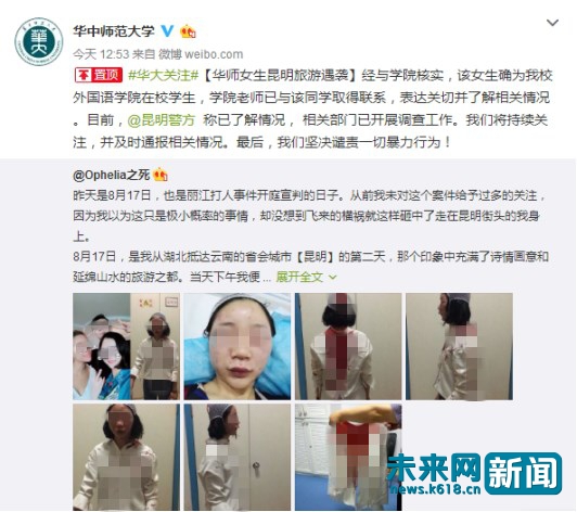 原标题:华中师范女大学生独游昆明被暴打 学校发声"谴责一切暴力行为"