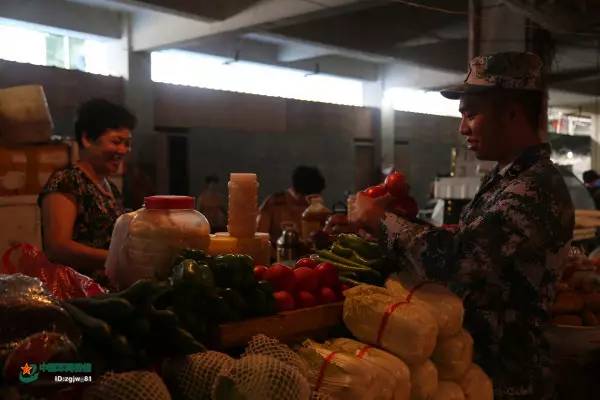 菜市场的阿姨与前来买菜的夏愉是老顾客了,军民一家亲,每次战士们来买菜,阿姨都格外地亲切。