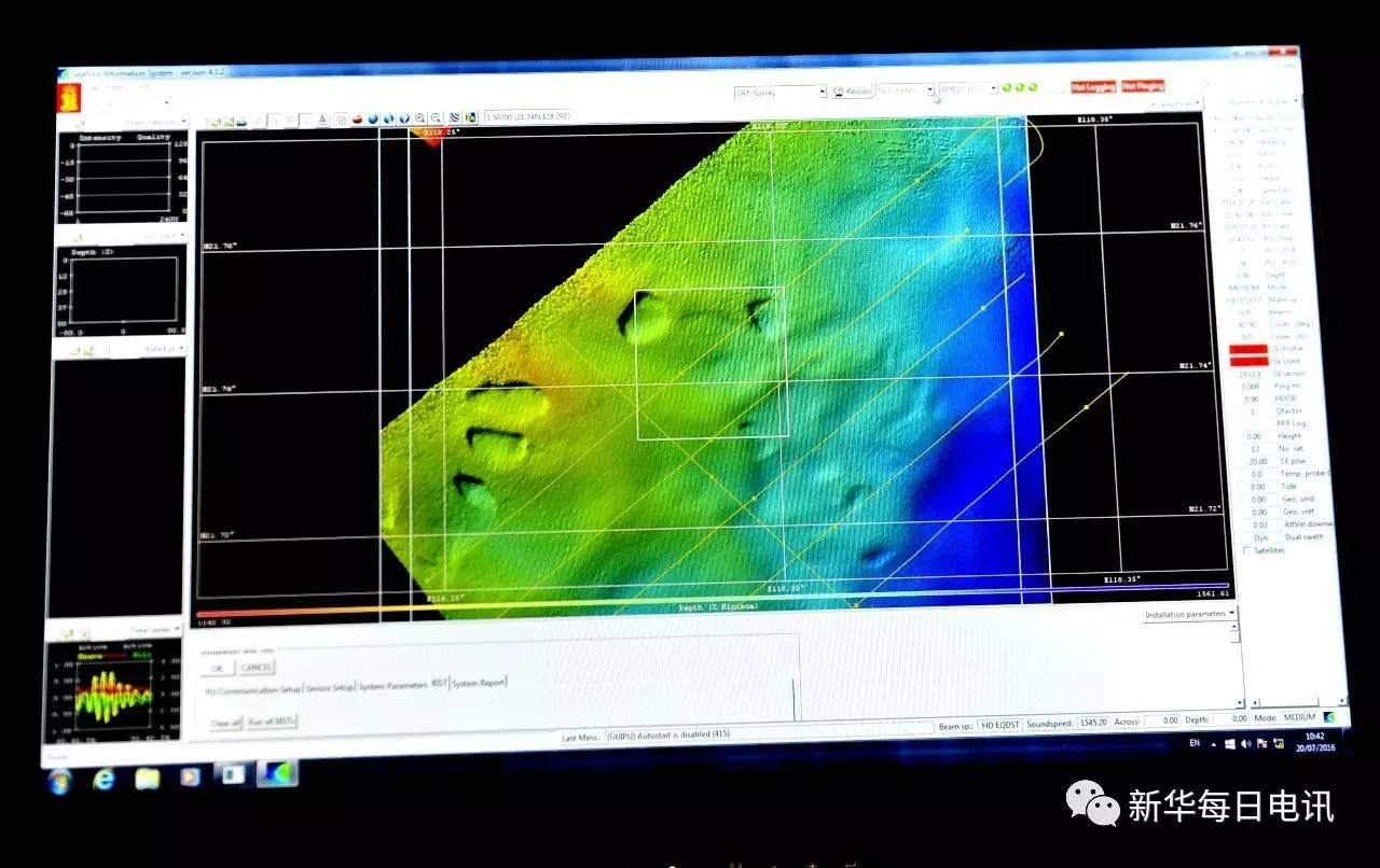 2016年7月19日,“张謇”号多波束测深系统电脑显示的南海海底“麻坑”。