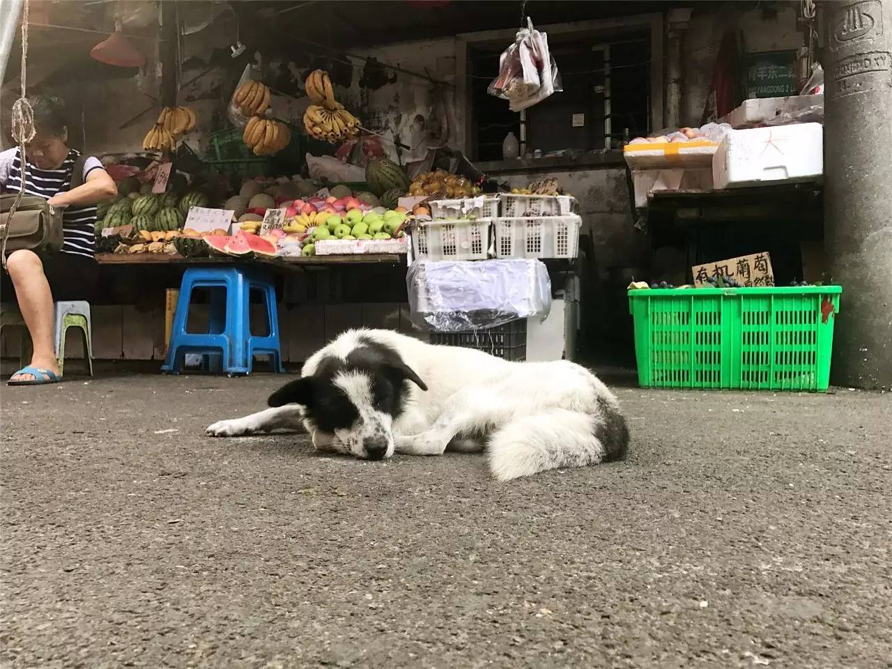 少了生意的老板,困倦面无表情,狗也熟悉地躺在路中央闭目养神。