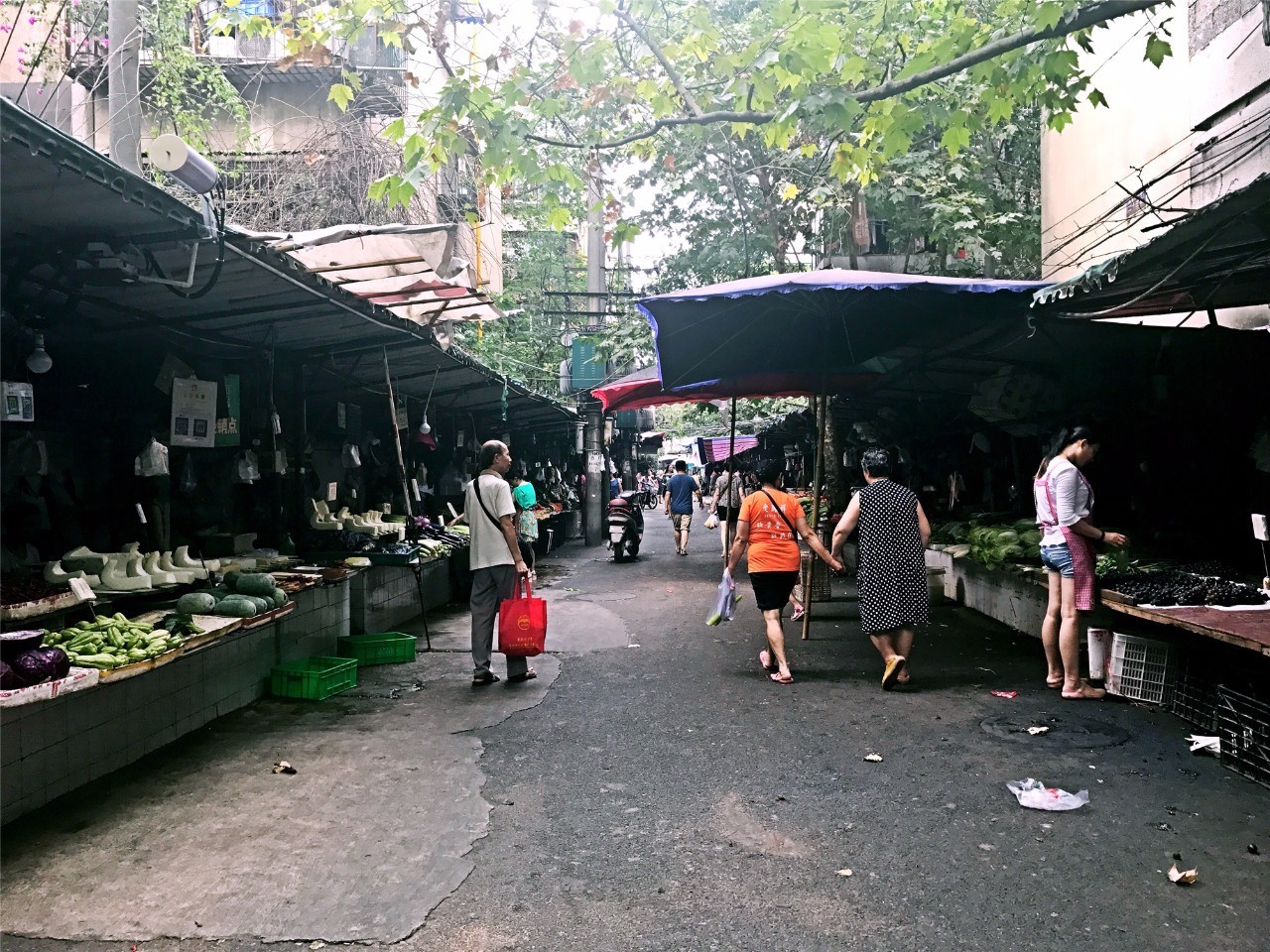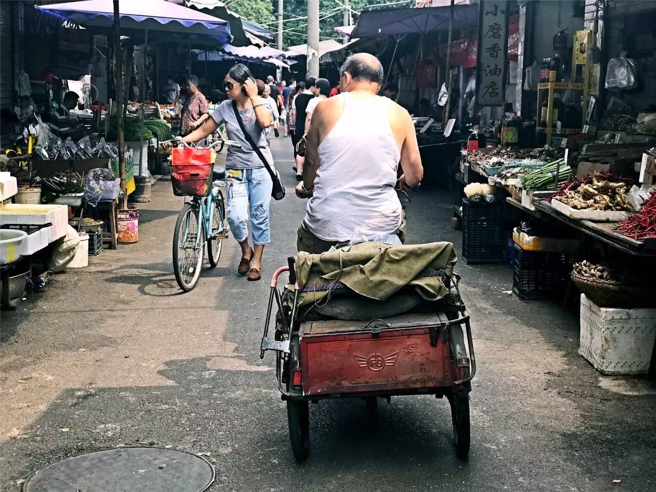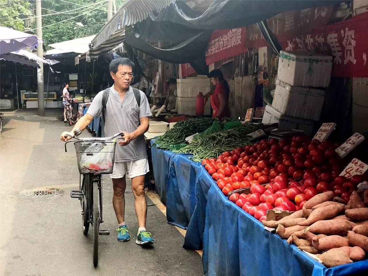 午觉醒来的人骑着车,或者穿着背心人字拖,慢悠悠地挑选自己中意的菜,肉和瓜果。