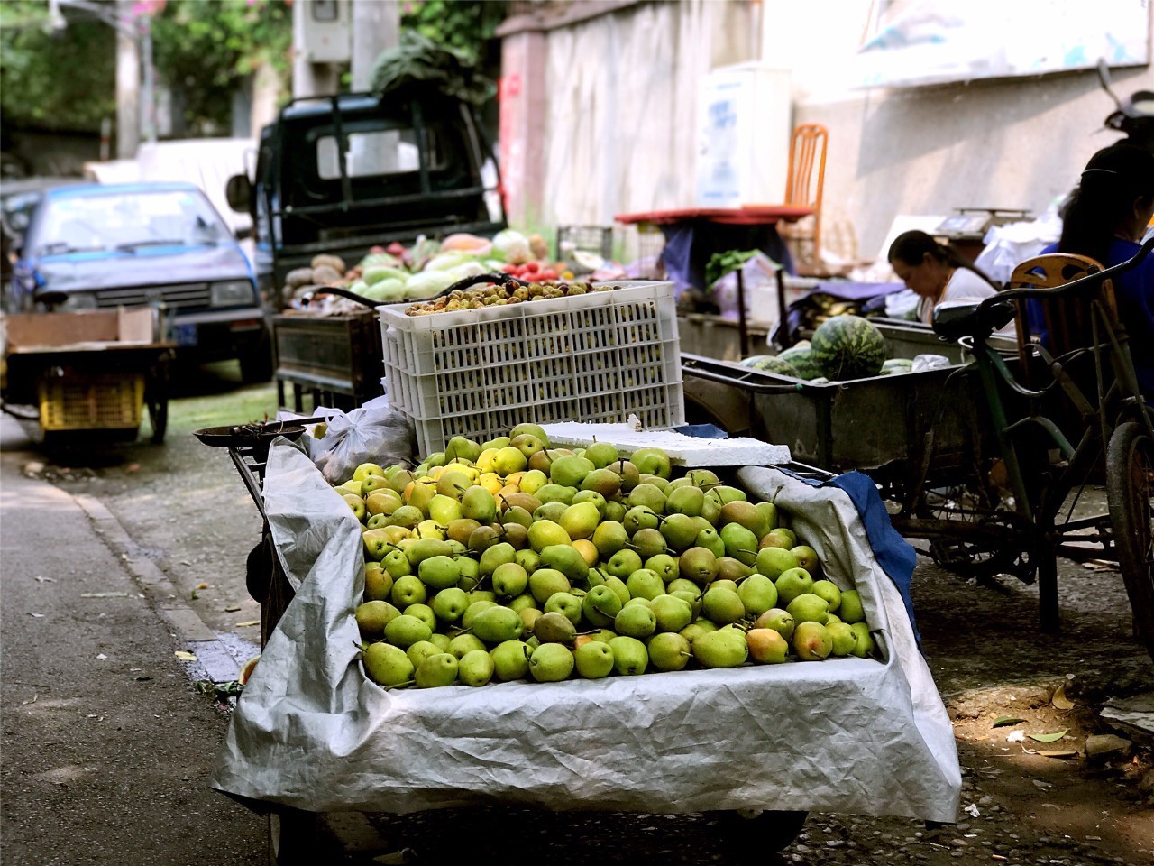 一溜烟,从某个巷口便钻出三五辆自行车。车筐、把手上,也是菜蔬。