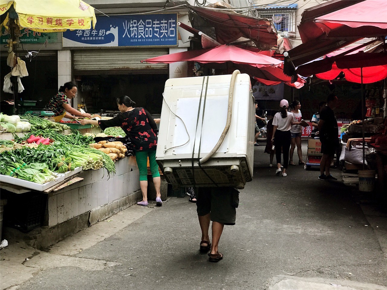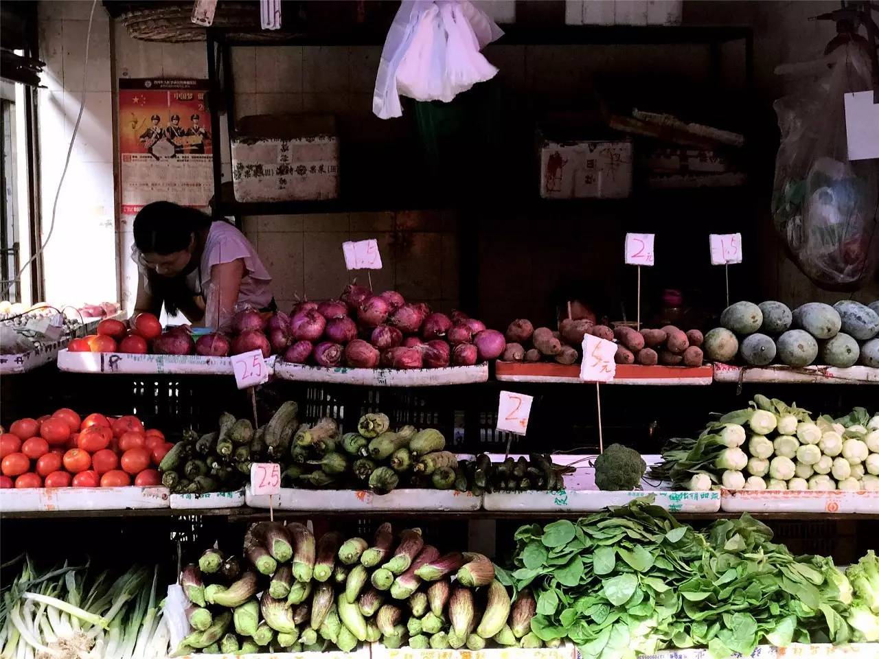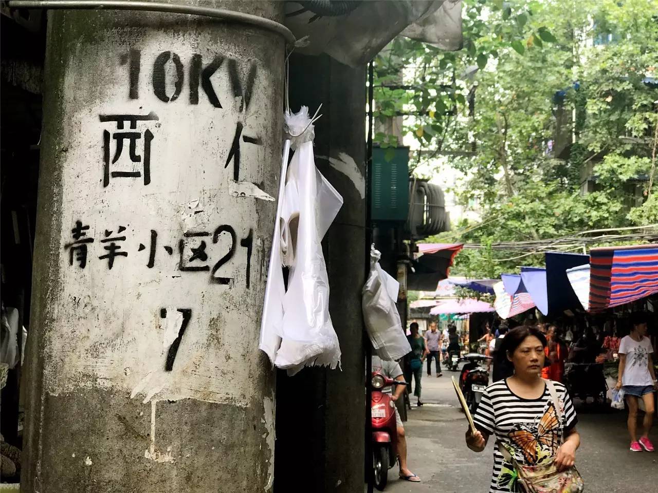 无论大妈还是小年轻,街上的人,随时都拎着蓝白塑料袋装着的菜蔬。