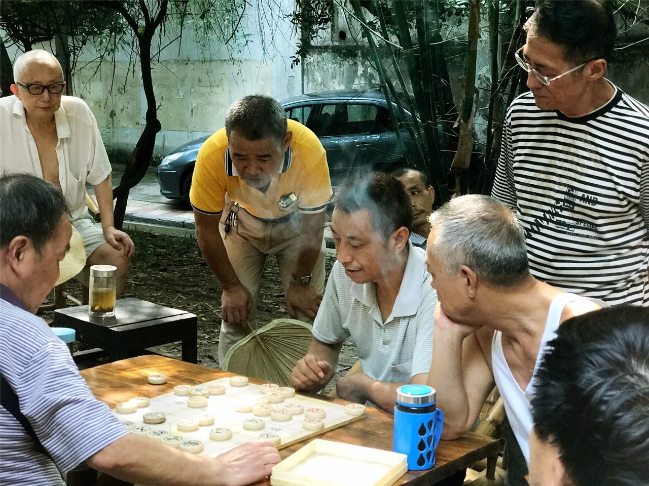 街头小花园内打牌的该是清闲的社区老人。麻将,长牌…几个大老爷们儿围着看两人对弈,观棋不语真君子,只见一人手中的香烟悄悄飘起萦绕,棋局更复杂了。