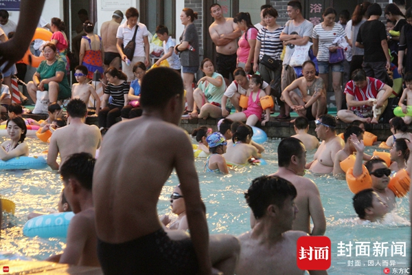 2017年7月16日,江西南昌市气象台再次发布“高温橙色预警”信号,预计14时到18时,主城及各区县气温将达38以上。主城将进入连续晴热高温模式,火热的阳光伴随着迎面而来的热浪,“烧烤模式”让不少市民选择水中消暑,市内各大游泳池周末也迎来人流高峰。在南昌市红谷滩新区赣江边上游泳池近千市民聚集在游泳池里,整个游泳池如下饺子。