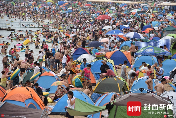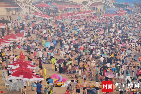 2017年7月12日,山东青岛,青岛市“入伏”首日出现高温天气,第一海水浴场日迎数万游客前来“下饺子”避暑纳凉。