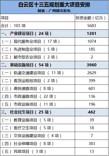 在此次规划中,白云区共安排了103项重大项目,分为产业建设、基础设施和社会民生三大板块。覆盖了轨道交通、市政道路、医教文等多个重大领域,具体投资金额如下: