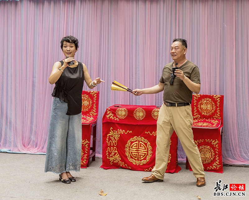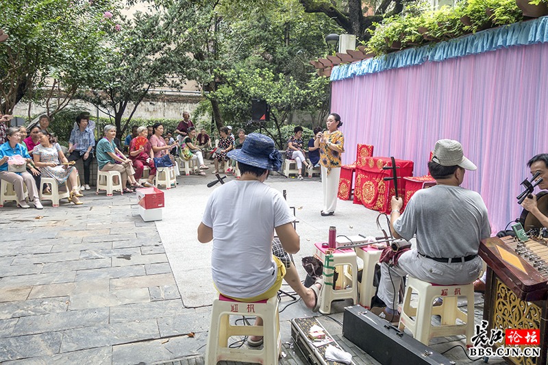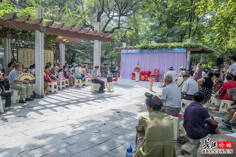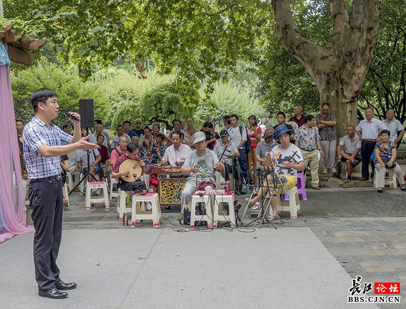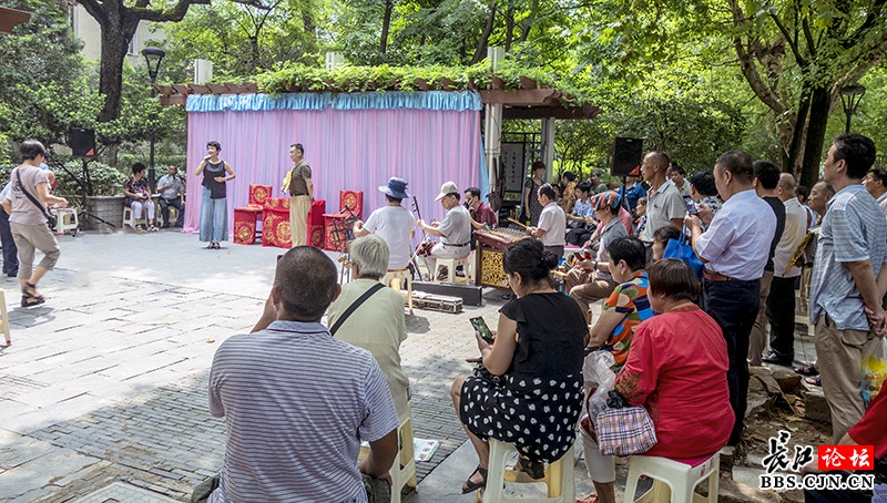 中山公园里的地方戏票友大舞台现场,地方戏票友在为大家演唱楚剧《梁祝》片段
