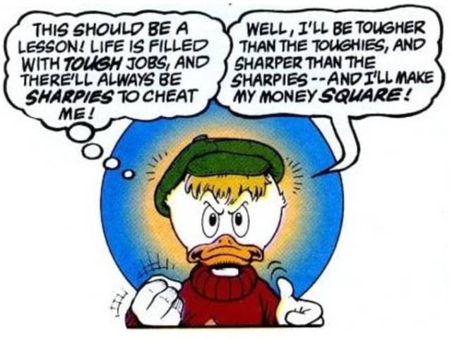然而事后才发现原来自己被骗了,他赚来的金币不过只是一枚普通的美国硬币,于是下定了一番决心,一定要赚很多很多的钱,“要变得比最坚强的人更坚强,比最狡猾的人更狡猾!”
